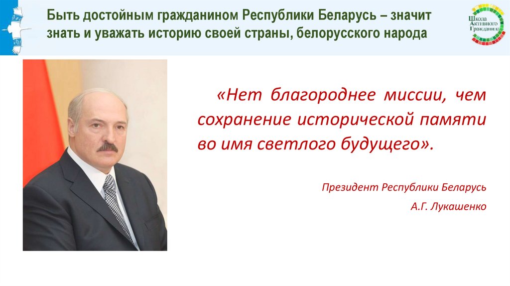 Быть достойным гражданином Республики Беларусь – значитзнать и уважать историю своей страны, белорусского народа