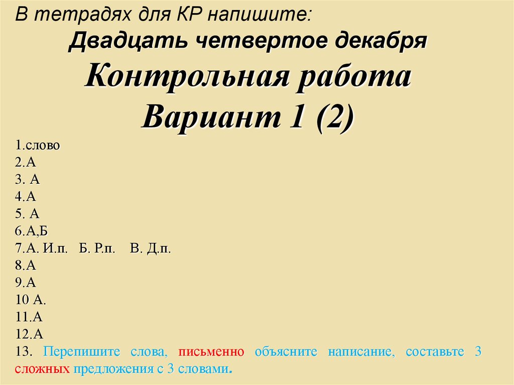 В тетрадях для КР напишите:Двадцать четвертое декабря
