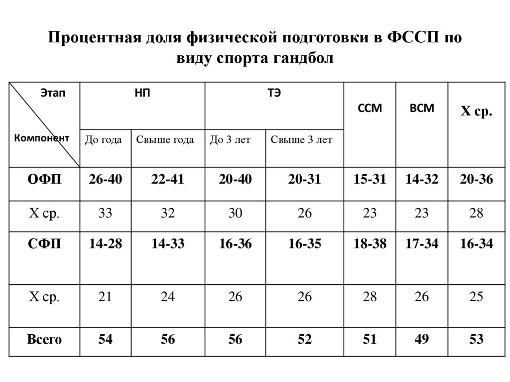 1. Процентная доля физической подготовки в ФССП по виду спорта гандбол