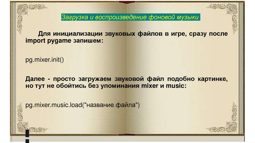Загрузка и воспроизведение фоновой музыкиДля инициализации звуковых файлов в игре, сразу после