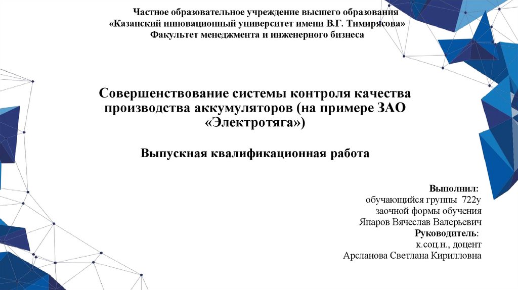 1. Совершенствование системы контроля качества производства аккумуляторов (на примере ЗАО «Электротяга») Выпускная