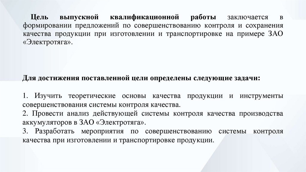 Цель выпускной квалификационной работы заключается вформировании предложений по совершенствованию контроля и сохранения