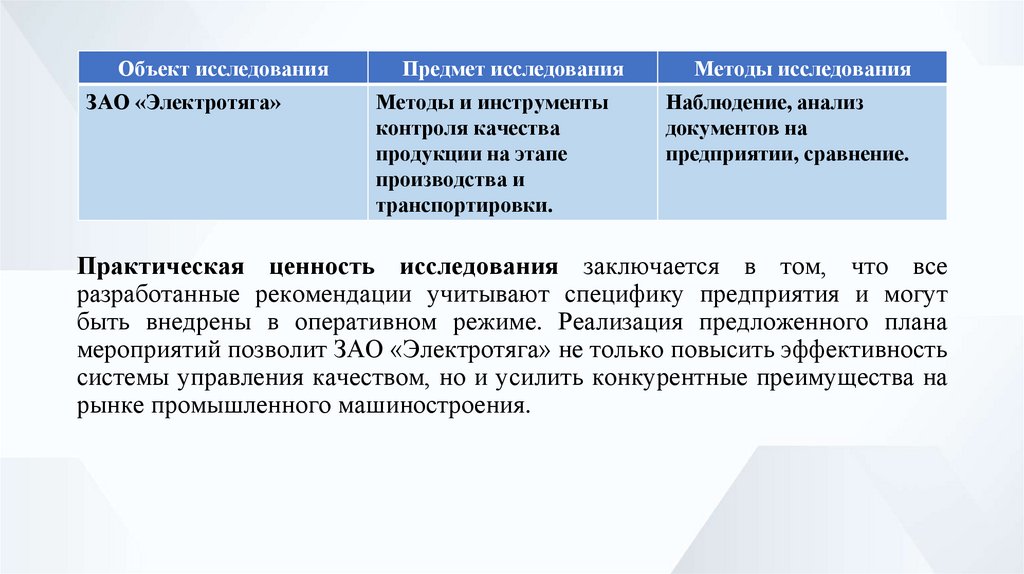 Объект исследованияЗАО «Электротяга»