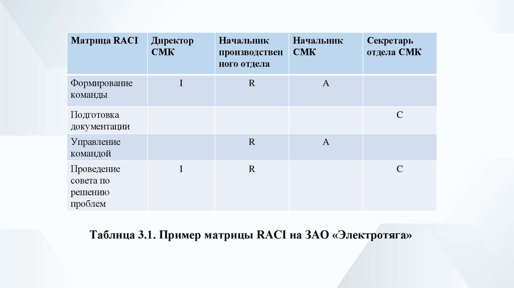 Таблица 3.1. Пример матрицы RACI на ЗАО «Электротяга»