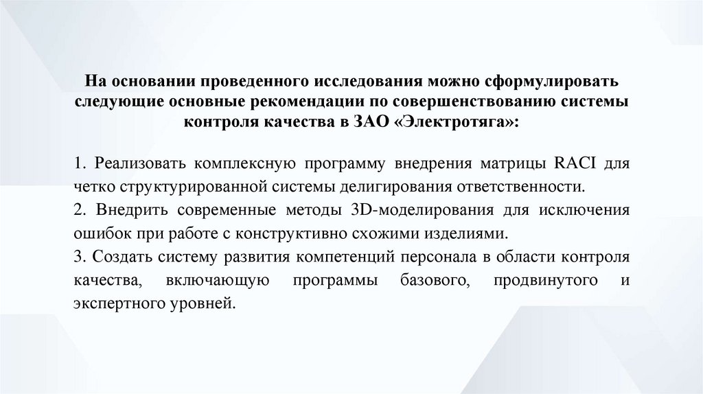 Анализ существующей системы контроля качества в ЗАО«Электротяга» выявил как положительные аспекты, так и области,