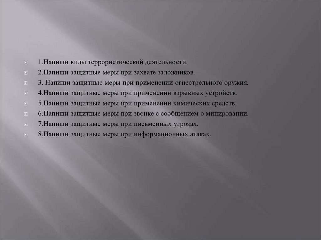 1.Напиши виды террористической деятельности.2.Напиши защитные меры при захвате заложников.