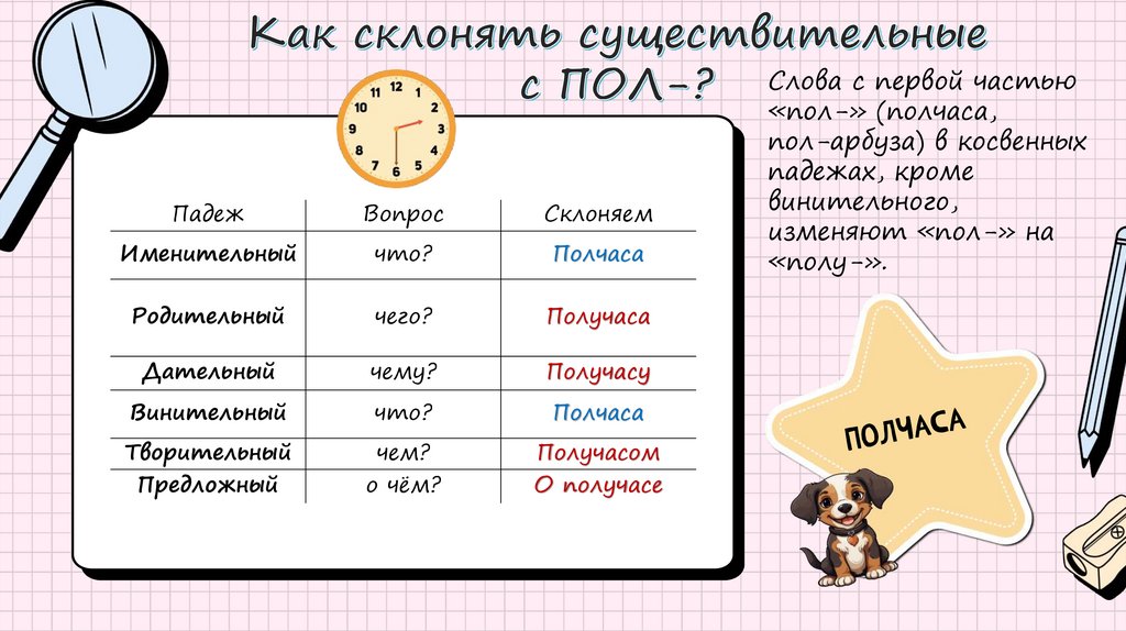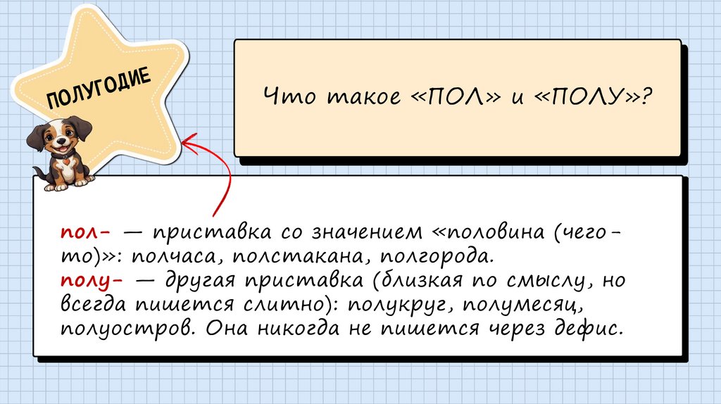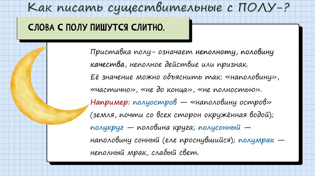 Что такое «ПОЛ» и «ПОЛУ»?пол- — приставка со значением «половина (чегото)»: полчаса, полстакана, полгорода.