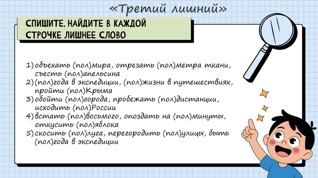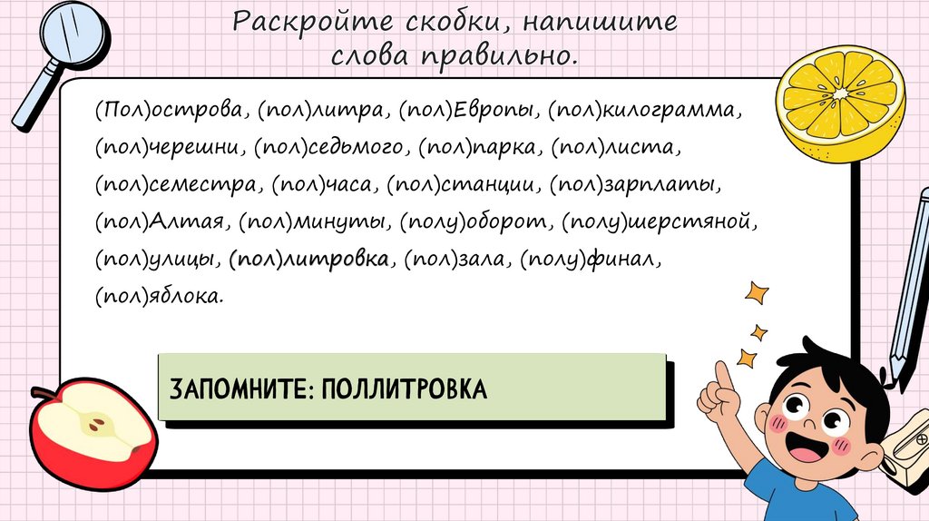 (Пол)острова, (пол)литра, (пол)Европы, (пол)килограмма,(пол)черешни, (пол)седьмого, (пол)парка, (пол)листа,