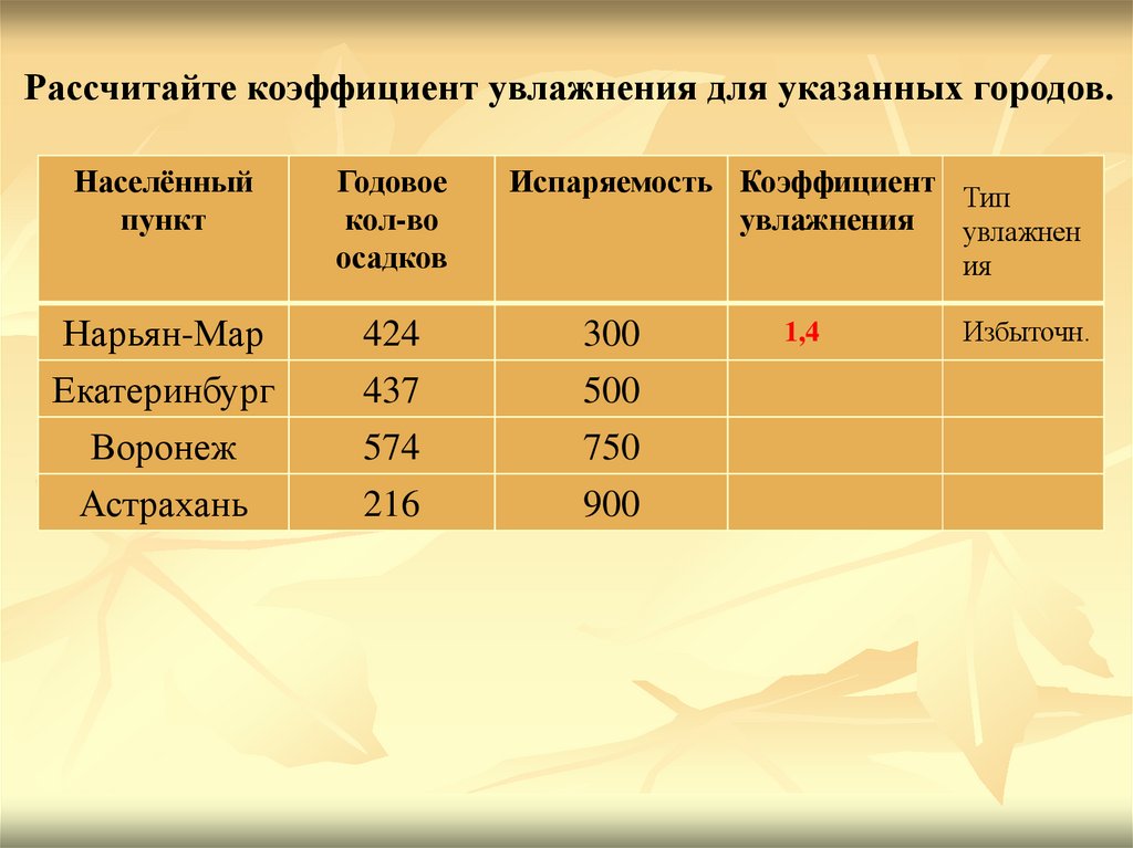 Рассчитайте коэффициент увлажнения для указанных городов.Населённый