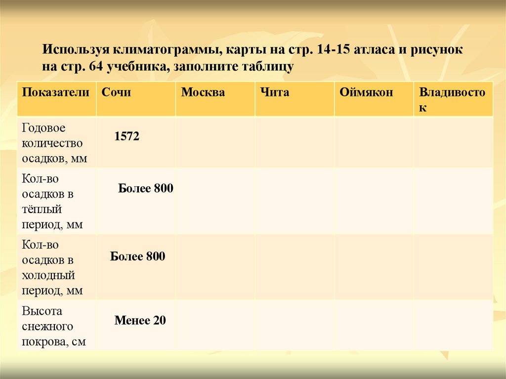 Используя климатограммы, карты на стр. 14-15 атласа и рисунокна стр. 64 учебника, заполните таблицу