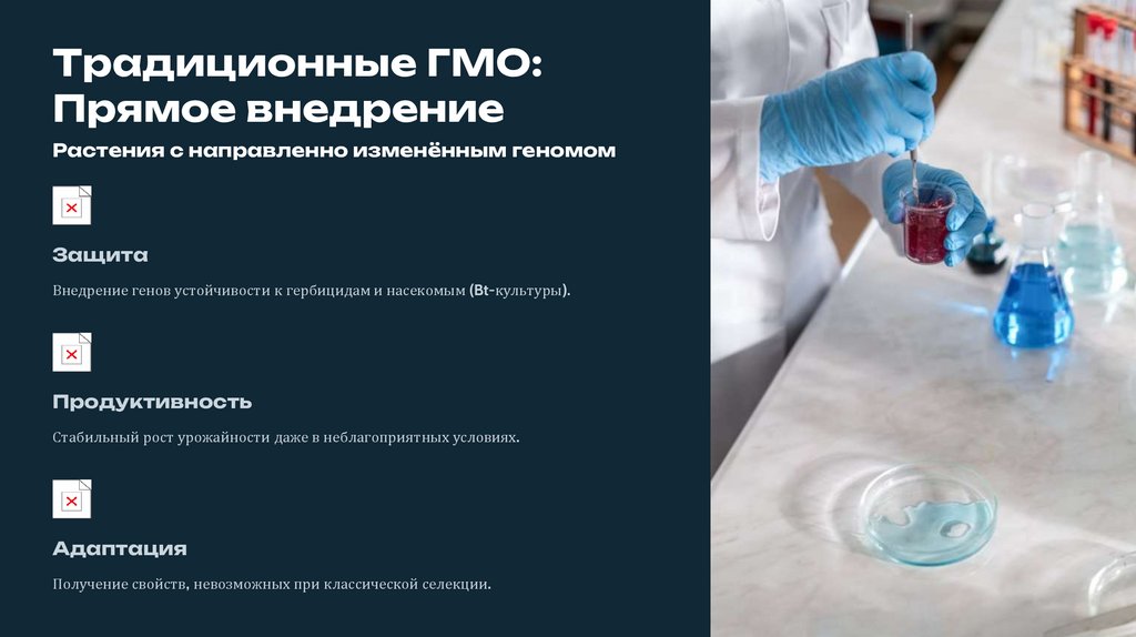 Внедрение генов устойчивости к гербицидам и насекомым (Bt-культуры).