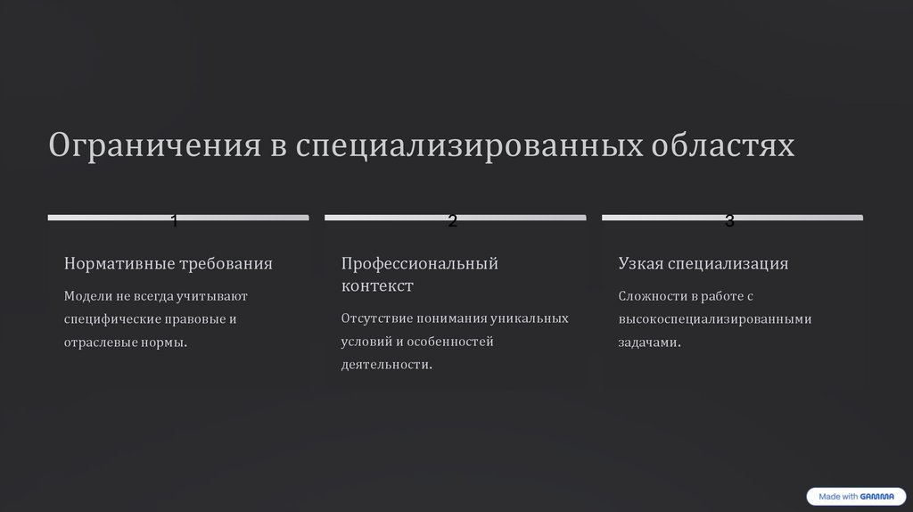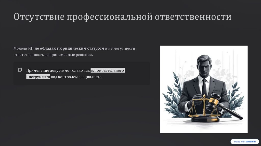 Отсутствие профессиональной ответственностиМодели ИИ не обладают юридическим статусом и не могут нести