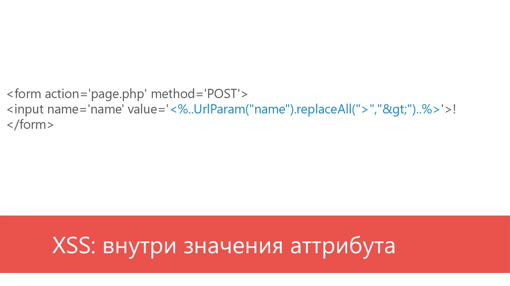 <form action='page.php' method='POST'><input name='name' value='<%..UrlParam("name").replaceAll(">",">")..%>'>!