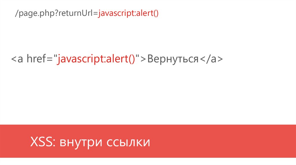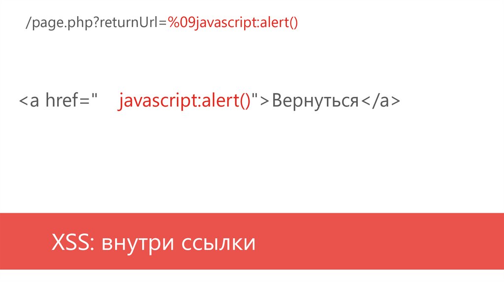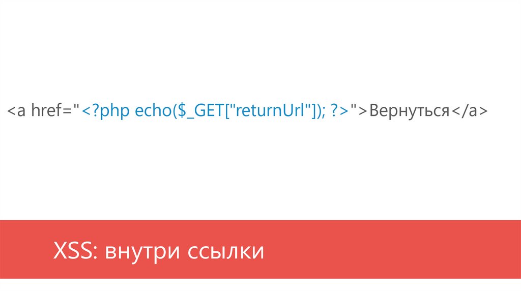 <a href="<?php echo($_GET["returnUrl"]); ?>">Вернуться</a>XSS: внутри ссылки