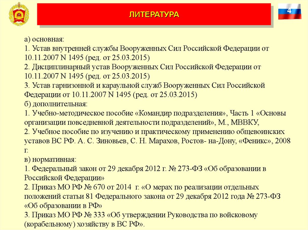 организации повседневной деятельности подразделений», М., МВВКУ,
