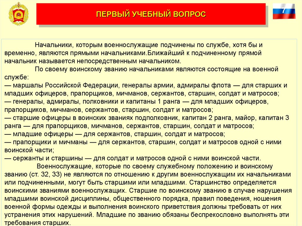 знания воинских уставов. Им принадлежит решающая роль в поддержании крепкой воинской дисциплины и уставного внутреннего порядка, а личный пример в