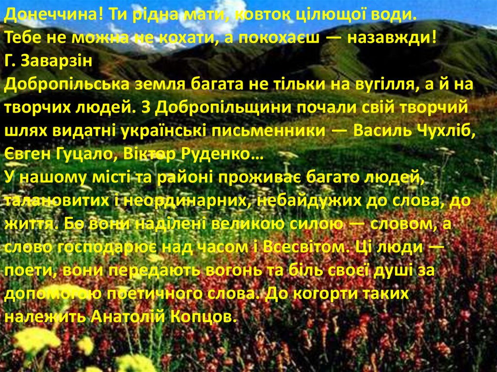 Донеччина! Ти рідна мати, ковток цілющої води.Тебе не можна не кохати, а покохаєш — назавжди!