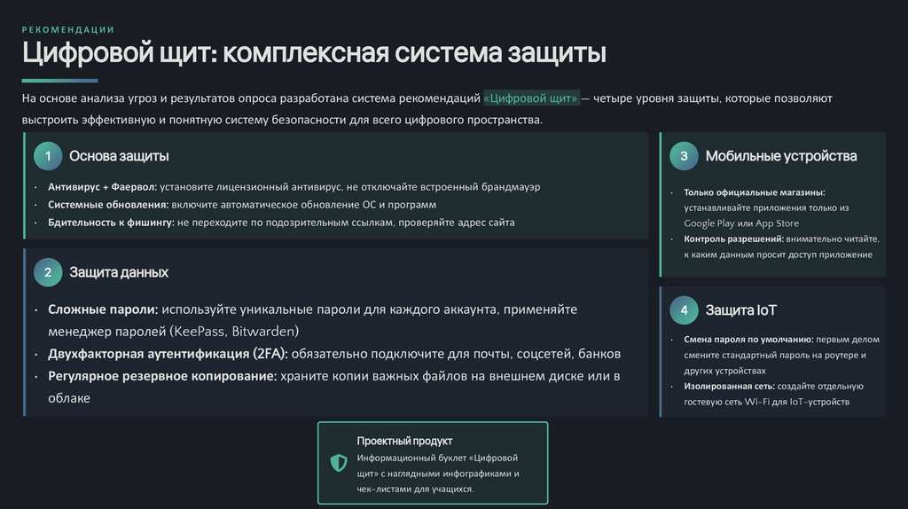 На основе анализа угроз и результатов опроса разработана система рекомендаций «Цифровой щит» — четыре уровня защиты, которые позволяют