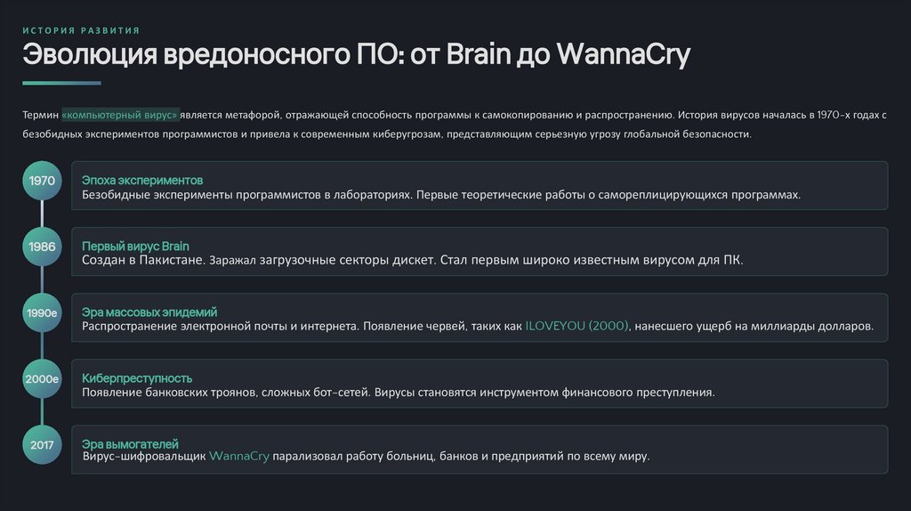 ИСТОРИЯ РАЗВИТИЯЭволюция вредоносного ПО: от Brain до WannaCry