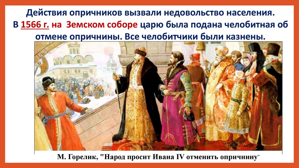 Действия опричников вызвали недовольство населения.В 1566 г. на Земском соборе царю была подана челобитная об