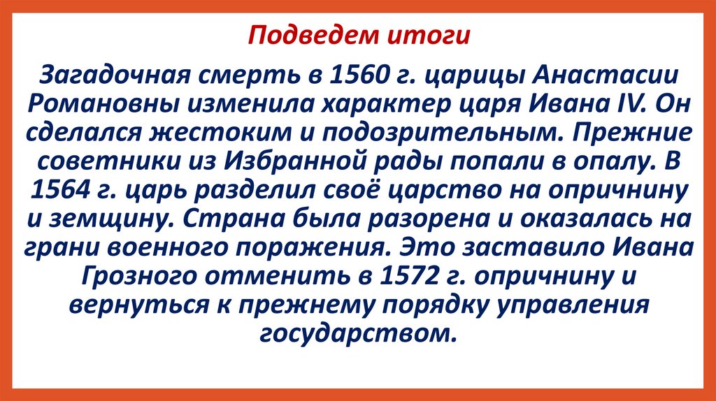 Подведем итогиЗагадочная смерть в 1560 г. царицы Анастасии