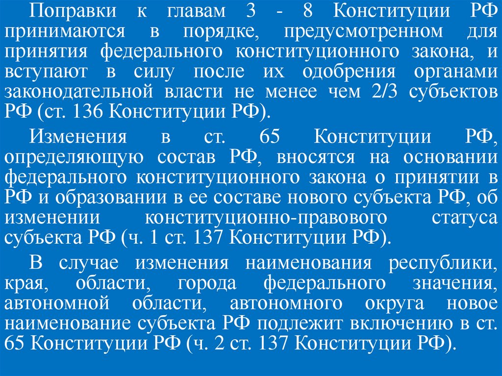 Поправки к главам 3 - 8 Конституции РФпринимаются в порядке, предусмотренном для