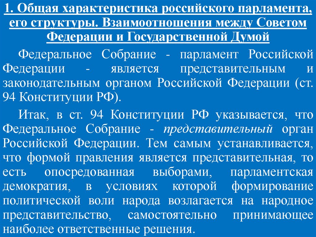 1. Общая характеристика российского парламента,его структуры. Взаимоотношения между Советом
