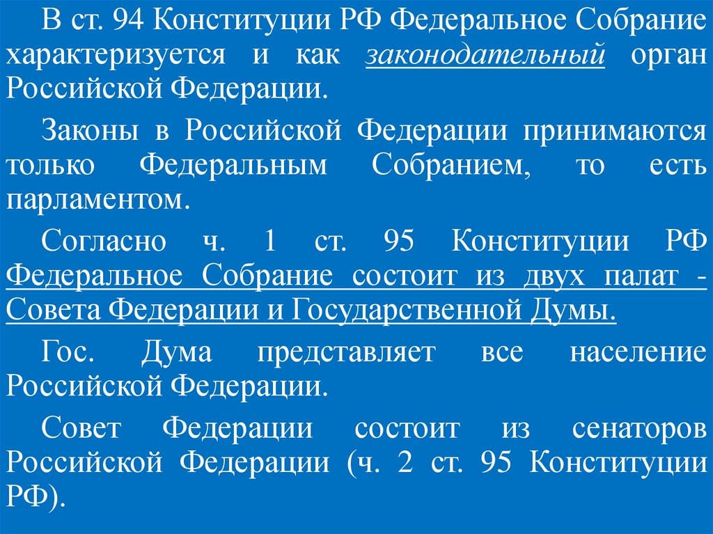 В ст. 94 Конституции РФ Федеральное Собраниехарактеризуется и как законодательный орган