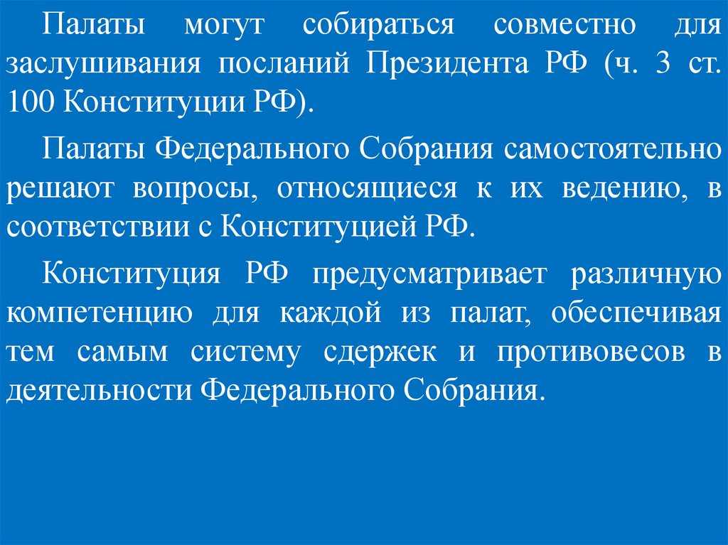 Палаты могут собираться совместно длязаслушивания посланий Президента РФ (ч. 3 ст.