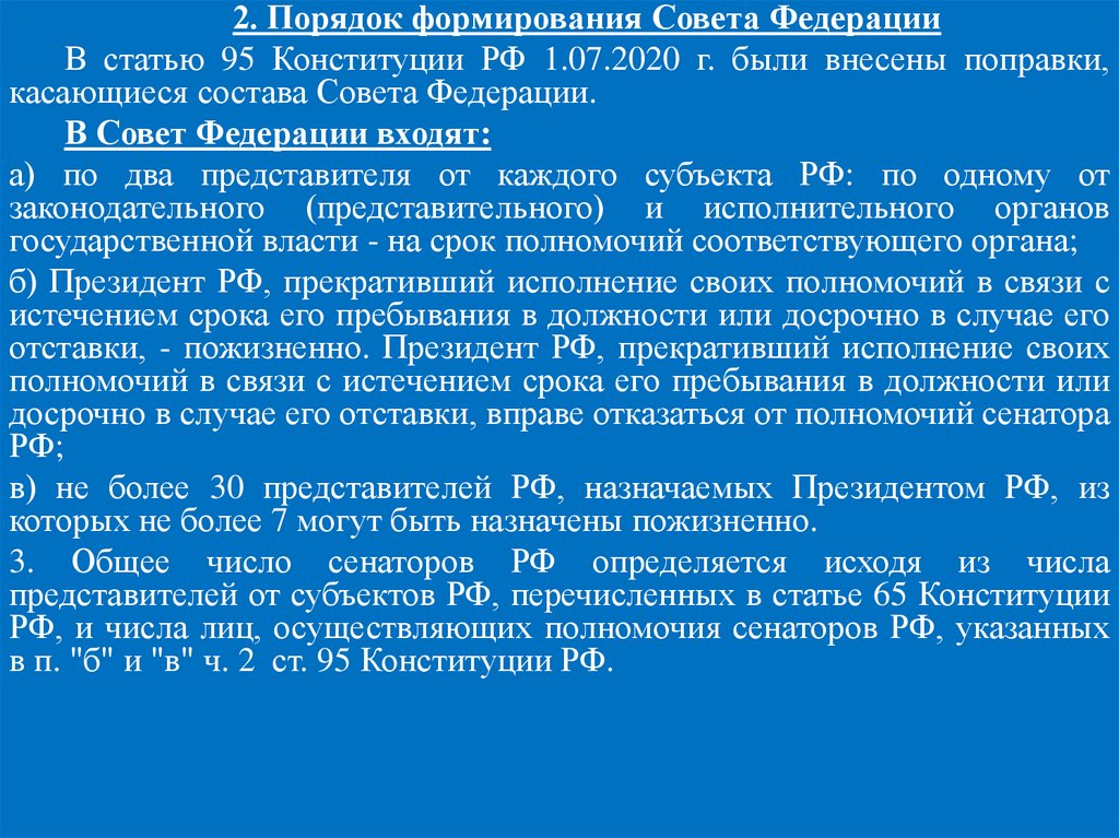 2. Порядок формирования Совета ФедерацииВ статью 95 Конституции РФ 1.07.2020 г. были внесены поправки,
