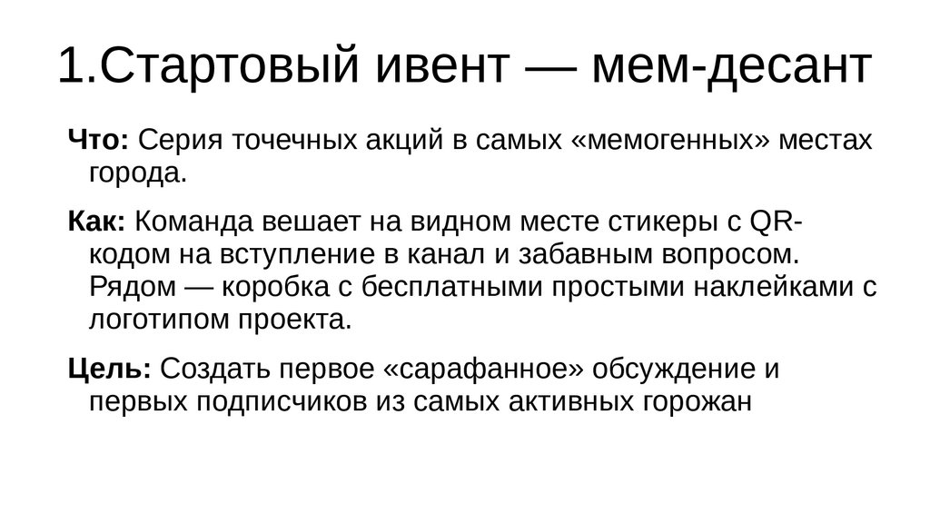 1.Стартовый ивент — мем-десантЧто: Серия точечных акций в самых «мемогенных» местах