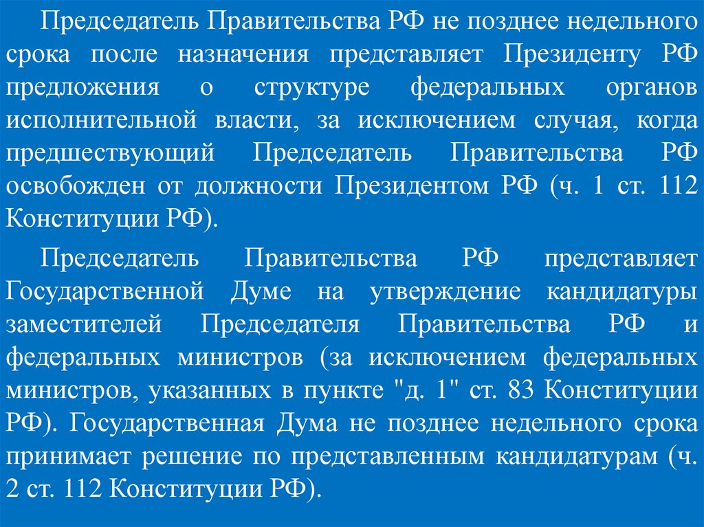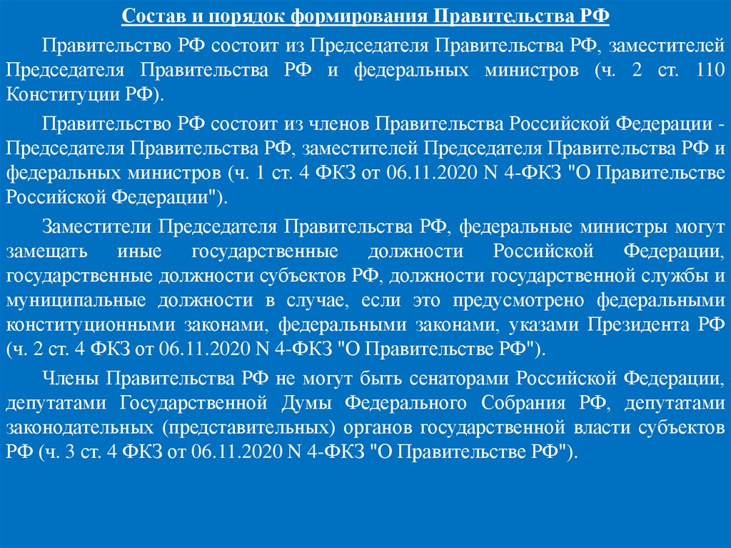 Правительство РФ состоит из членов Правительства Российской Федерации Председателя Правительства РФ, заместителей Председателя Правительства РФ и