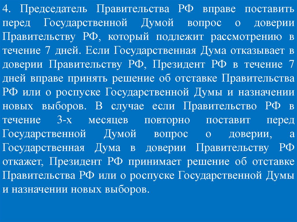 4. Председатель Правительства РФ вправе поставитьперед Государственной Думой вопрос о доверии
