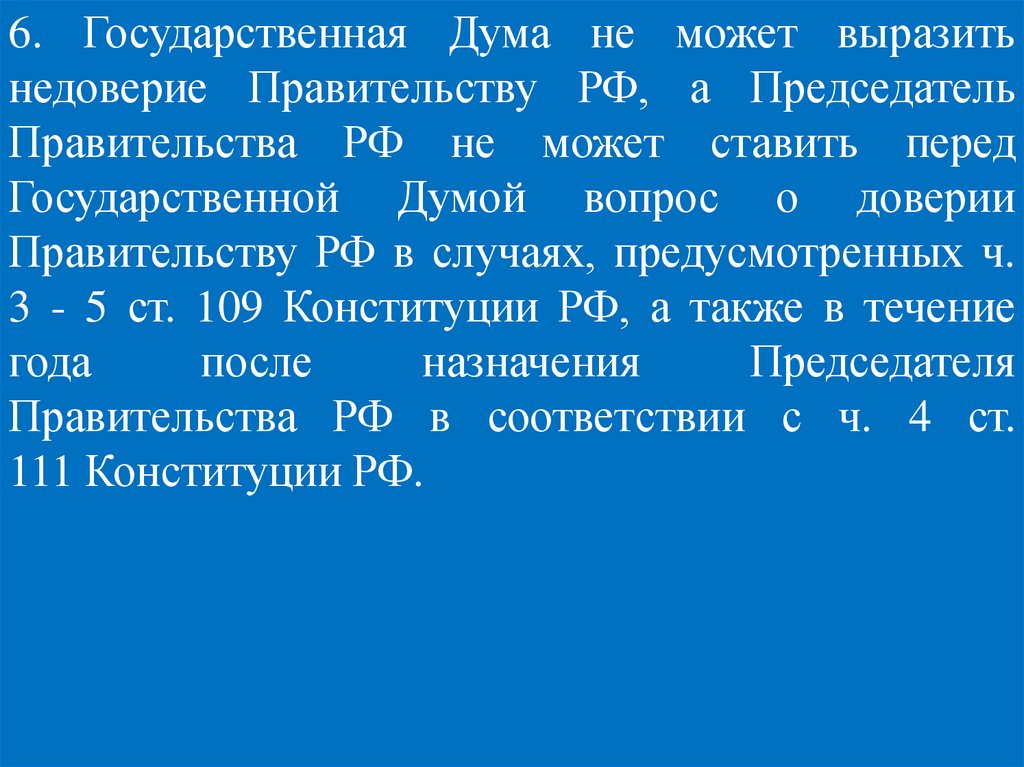 6. Государственная Дума не может выразитьнедоверие Правительству РФ, а Председатель