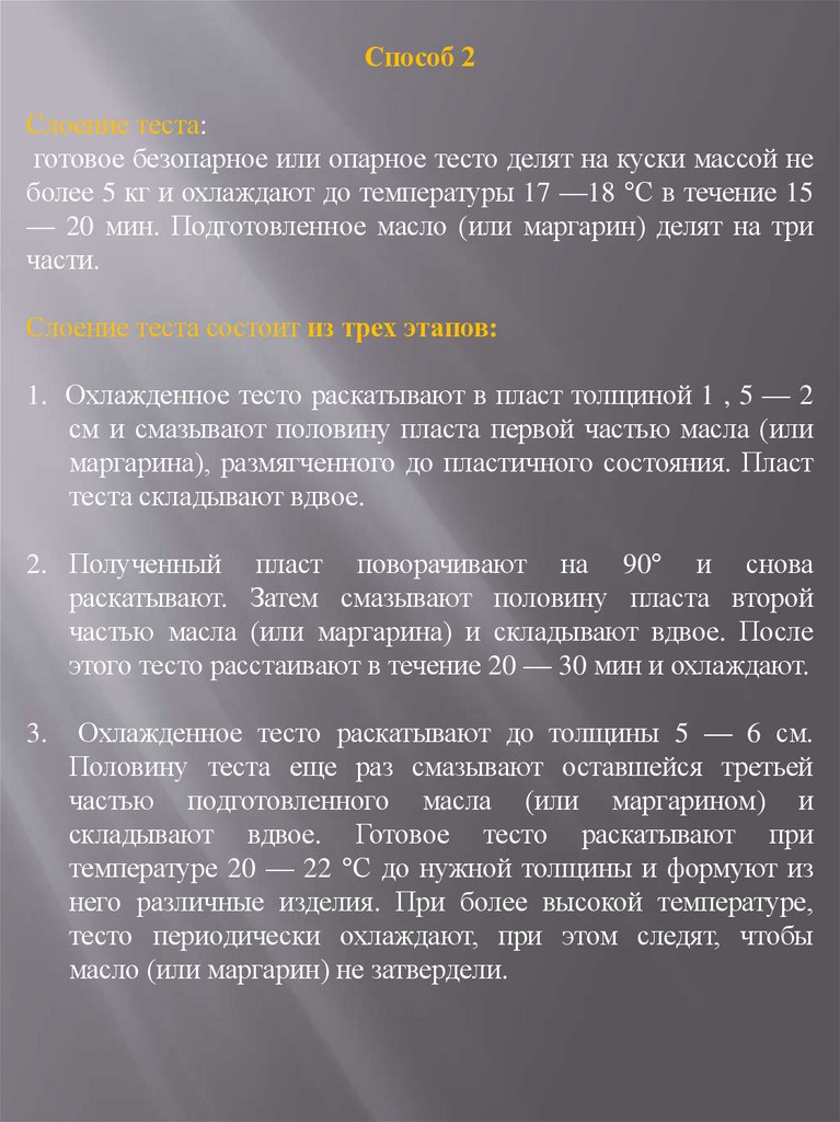 Пласт складывают втрое таким образом, чтобыполучилось два слоя масла и три слоя теста .