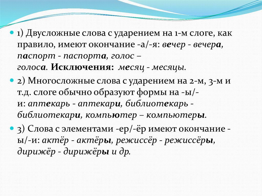 1) Двусложные слова с ударением на 1-м слоге, какправило, имеют окончание -а/-я: вечер - вечера,