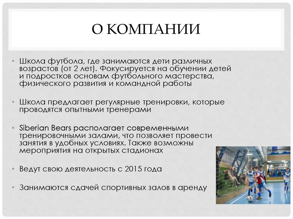 О КОМПАНИИ• Школа футбола, где занимаются дети различных