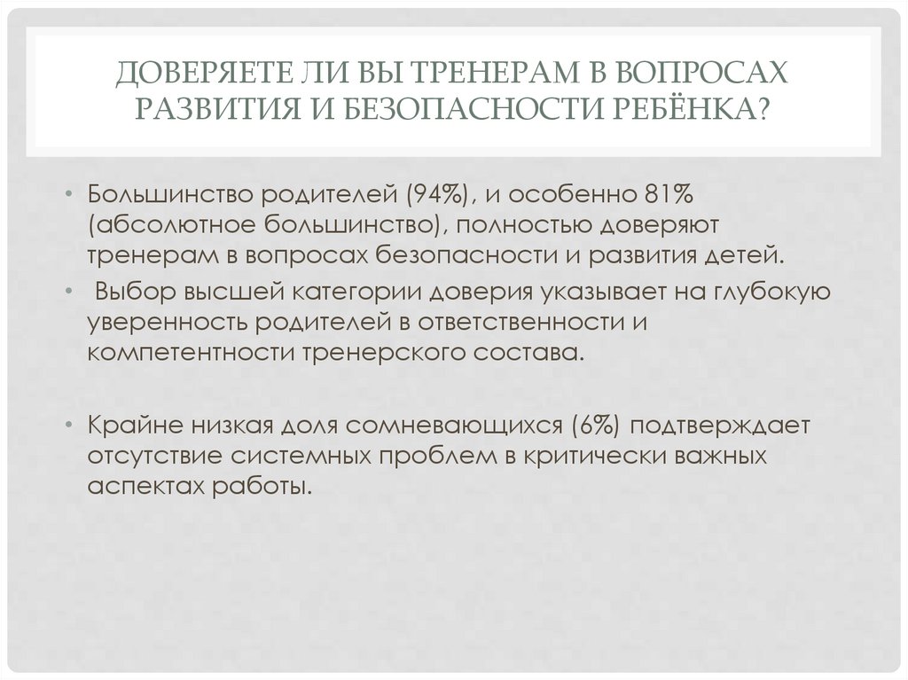 ДОВЕРЯЕТЕ ЛИ ВЫ ТРЕНЕРАМ В ВОПРОСАХРАЗВИТИЯ И БЕЗОПАСНОСТИ РЕБЁНКА?