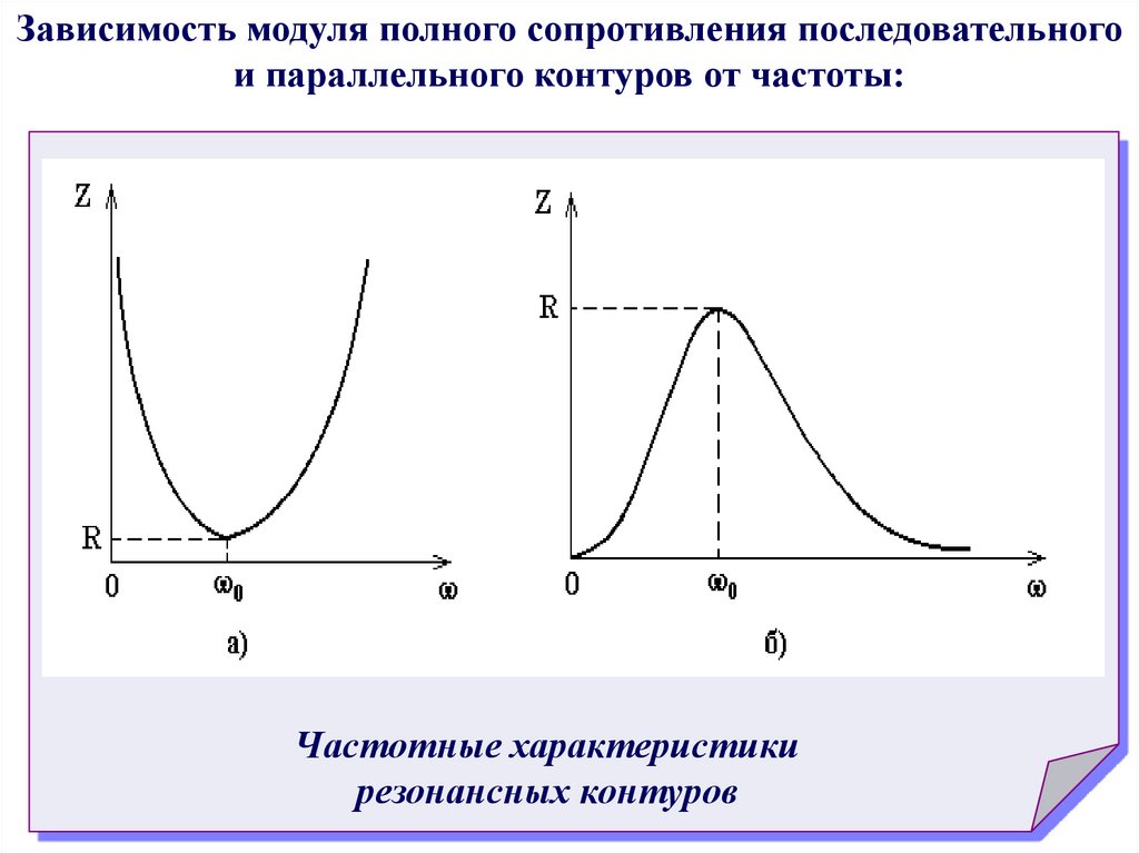 Зависимость модуля полного сопротивления последовательногои параллельного контуров от частоты: