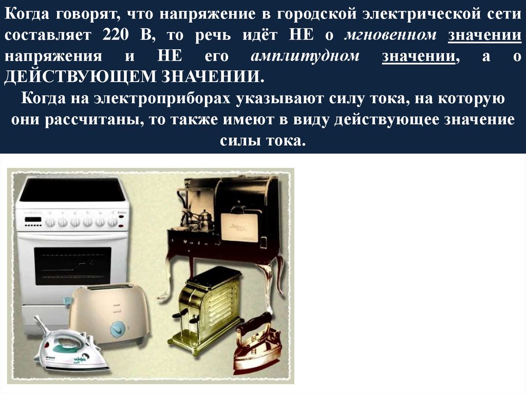 Когда говорят, что напряжение в городской электрической сетисоставляет 220 В, то речь идёт НЕ о мгновенном значении
