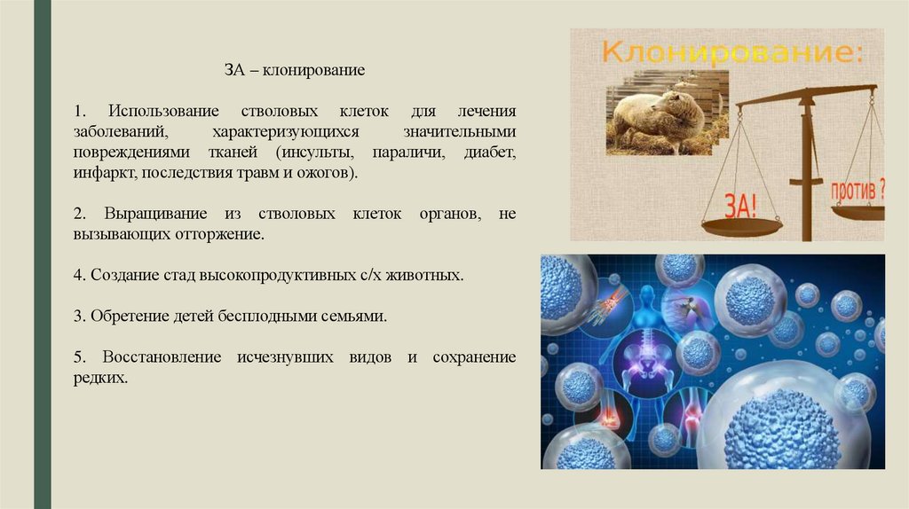 ЗА – клонирование1. Использование стволовых клеток для лечения