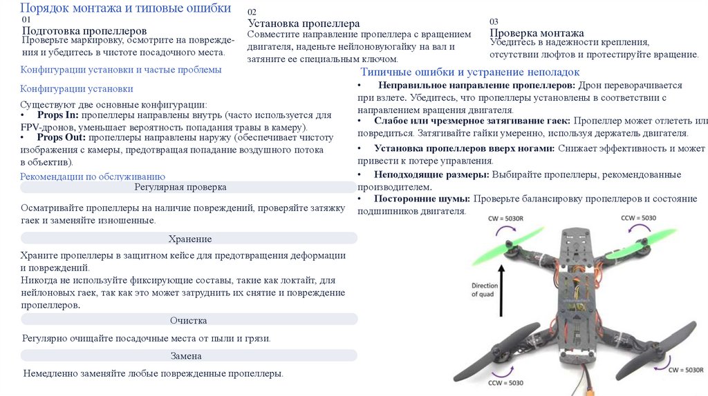 • Установка пропеллеров вверх ногами: Снижает эффективность и может