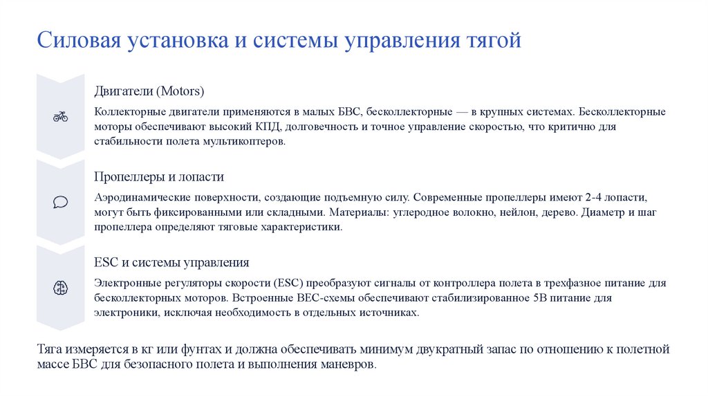 Тяга измеряется в кг или фунтах и должна обеспечивать минимум двукратный запас по отношению к полетной