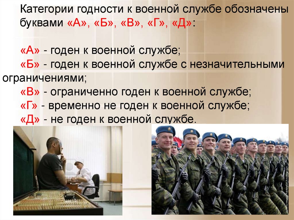 Категории годности к военной службе обозначеныбуквами «А», «Б», «В», «Г», «Д»: