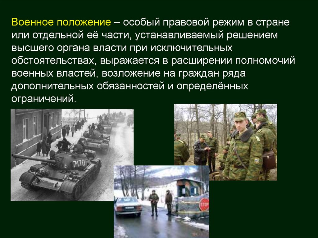 Военное положение – особый правовой режим в странеили отдельной её части, устанавливаемый решением