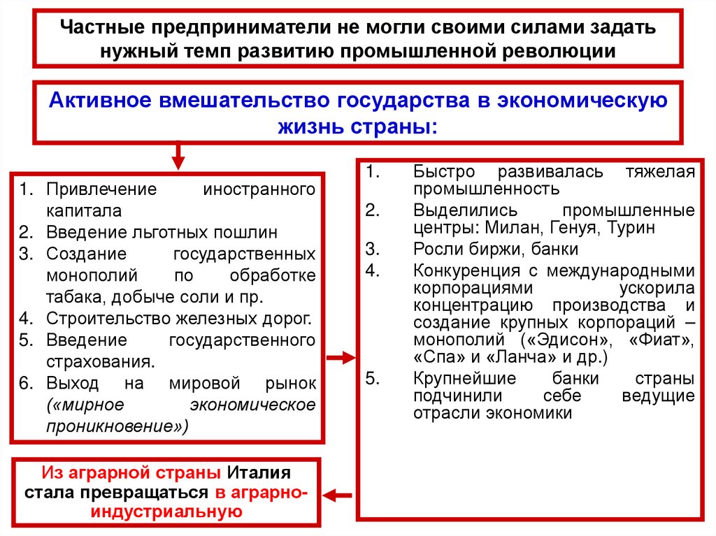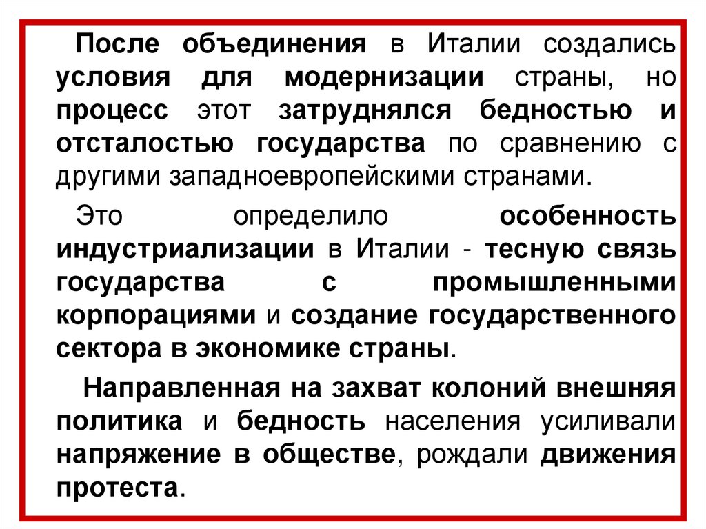 После объединения в Италии создалисьусловия для модернизации страны, но