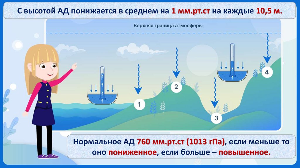 С высотой АД понижается в среднем на 1 мм.рт.ст на каждые 10,5 м.Нормальное АД 760 мм.рт.ст (1013 гПа), если меньше то