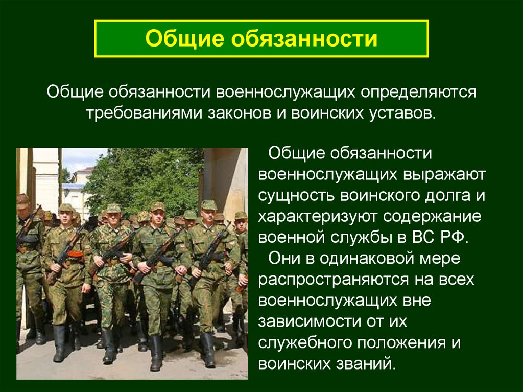 Общие обязанностиОбщие обязанности военнослужащих определяются