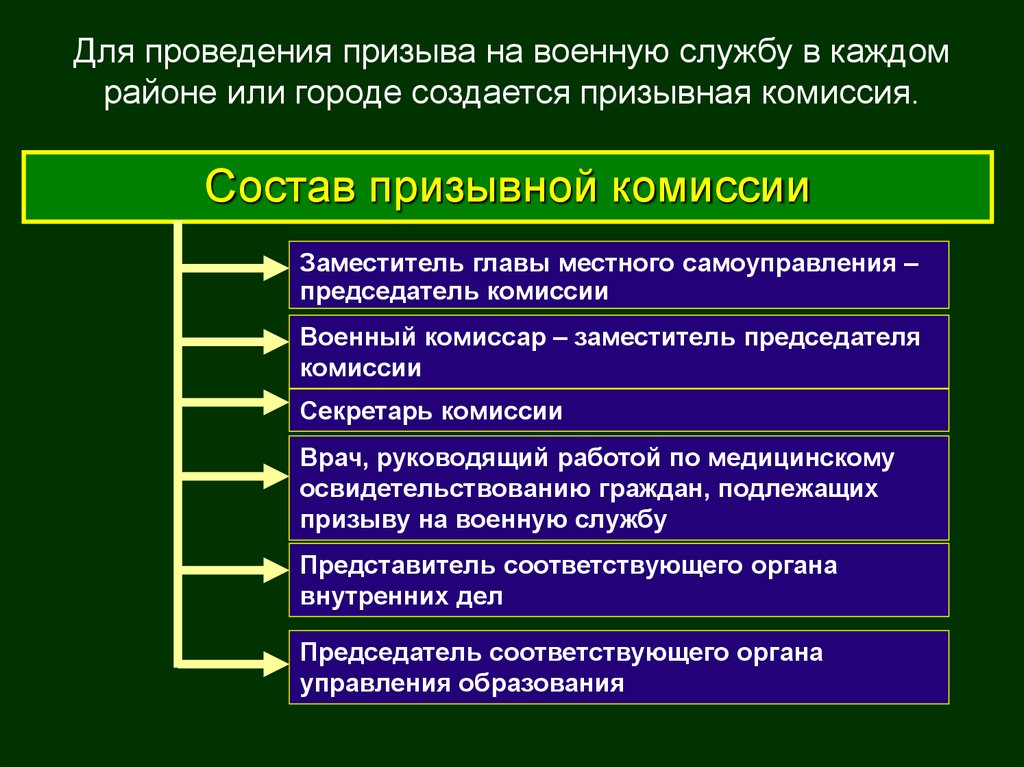 Для проведения призыва на военную службу в каждомрайоне или городе создается призывная комиссия.