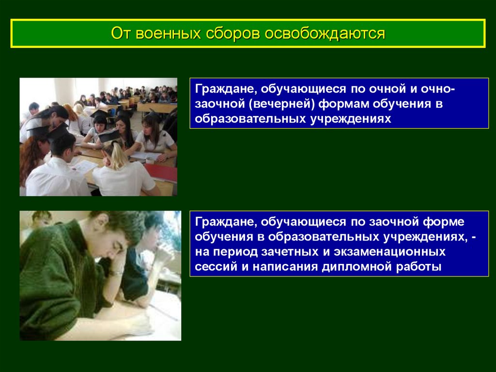 От военных сборов освобождаютсяГраждане, обучающиеся по очной и очнозаочной (вечерней) формам обучения в